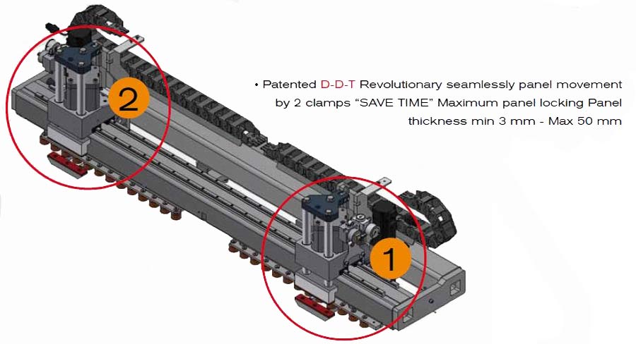 The X axis movement is obtained through the use of the patented DDT or Double Dynamic Transport system. The system is composed of a two gripper system which are driven by two brushless motors. By using two grippers, material can be seamlessly and continuously moved along the X axis without interrupting the milling or channeling processes. The system also provides considerable stability of the piece as it is being milled. The use of a single clamp is also used in the case of a smaller piece where the use of both grippers is not feasible. The Movement of the grippers in the X and the carriage in the Y axis are by brushless motors driving eplcyclic reduction gear, rack and pinion with a high degree of precision. The mobile beam or carriage moves on high precision pre-loaded ball runner blocks and linear guides made of rectified and hardened steel. Ball runner blocks for all axis are equipped with a seal guaranteeing maximum protection from dirt and dust.